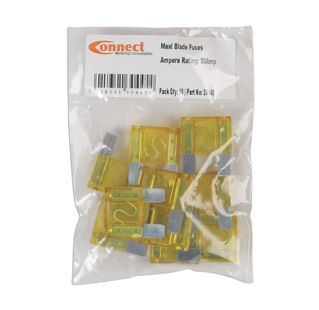 A pack of 20 amp maxi blade fuses for automotive use, designed to protect high current circuits up to 100 amps.