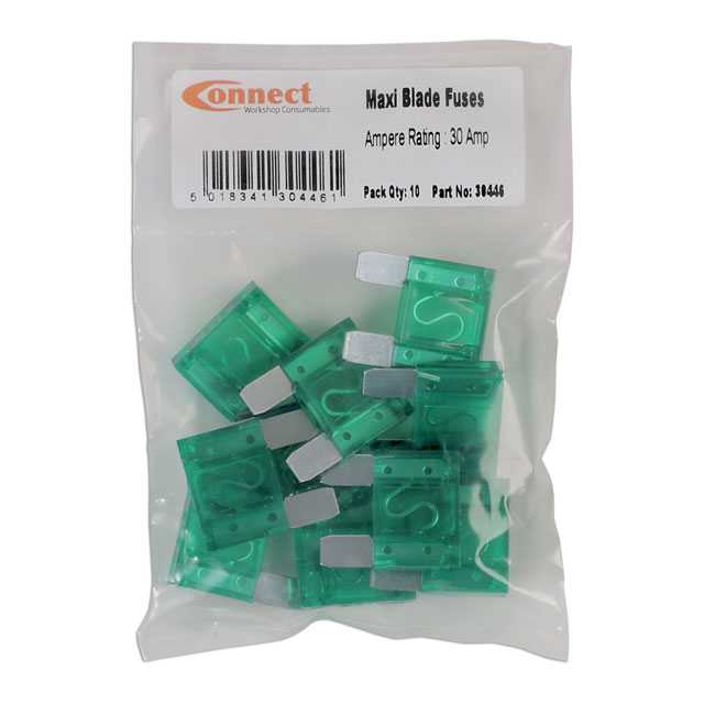 A pack of 30 amp maxi blade fuses for automotive use, designed to protect high current circuits up to 100 amps.