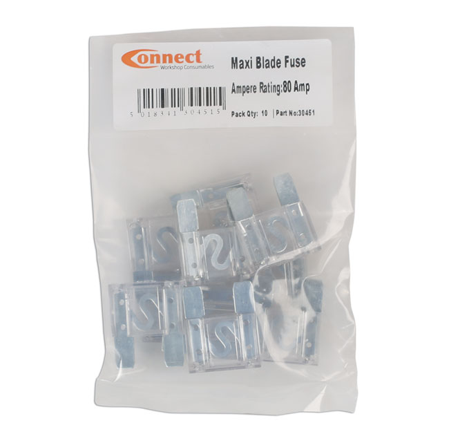 A pack of 80 amp maxi blade fuses for automotive use, designed to protect high current circuits up to 100 amps.