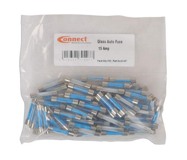 A pack of 15 amp quick blow auto glass fuses with visible fuse element, used to protect the electrical circuit against overload and short circuit on vehicles.