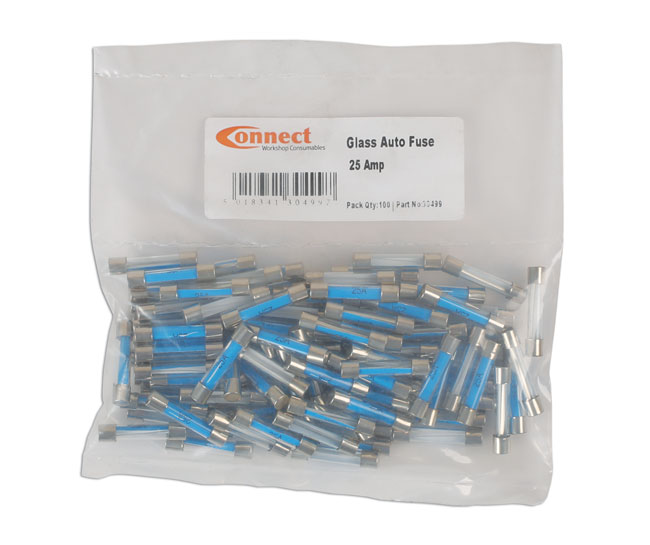 A pack of 25 amp quick blow auto glass fuses with visible fuse element, used to protect the electrical circuit against overload and short circuit on vehicles.