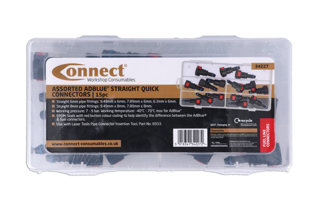 A set of 5 different sized straight AdBlue® fuel line quick connectors allowing for tight connections on fuel line inner diameters of 6mm & 8mm. Quick connectors are designed for the automotive industry for the transfer of fuel, oil, water cooling systems and air. The self locking connector enables it to be connected & disconnected with ease and speed, with the wide operating temperature range ensures it can cope with the extreme temperatures that could lead to cracking and leaks. To ease the fitting of the hard plastic fuel pipe to the connectors, use Laser Tools Pipe Connector Insertion Tool, Part No. 6933.