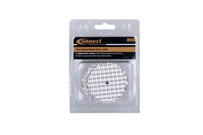 Exhaust under body heat shields have an annoying habit of failing around the area of their fixing point leading to rattling noises. The heat shields are usually still serviceable but their mounting holes will have become too big for the clamping washers to fix them in place. The Connect 34317 kit provides a 52mm diameter disc of heat shield material to allow the original shield to be repaired and reused when used in conjunction with a heat shield retaining washer.
