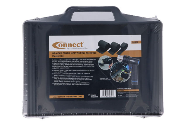 The Connect 34327 Braided Fabric Heat-Shrink Sleeving Master Kit includes a butane gas-powered hot air gun and a selection of fabric heat-shrink sleeves in sizes ranging from 12mm to 80mm in diameter. Ideal for use on wiring looms, coolant pipes, fuel lines, and battery cabling, the flexible, abrasion-resistant material provides protection in both hot and cold environments—perfect for engine bays and vehicle undercarriages. It helps reduce vibration noise and minimises wear on wiring and pipes caused by friction. As well as its protective function, the sleeving can also be used to enhance the appearance of engine bays and other areas during restorations. Equally ideal for the professional and enthusiast. Suitable for a wide range of applications, including automotive, marine, and robotics.