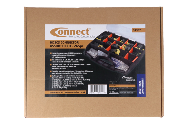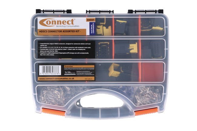 An assorted box of HDSCS (Heavy-Duty Sealed Connectors) includes terminals and seals. Suitable for a range of applications, including commercial and off-road vehicles. Supplied in a multi-compartment storage case with carrying handle.