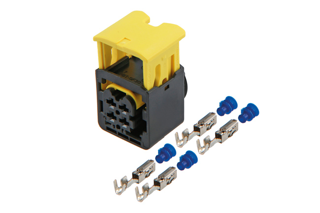 - Inhalt: Ein 4-poliges Steckergehäuse, vier Klemmen 2,8 und vier Wetterschutzdichtungen (blau).