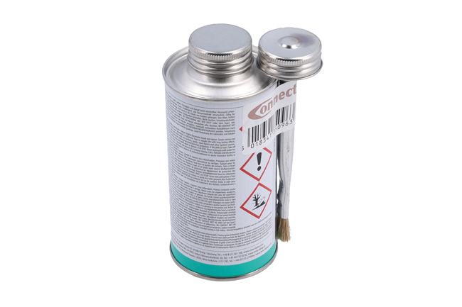 This tyre vulcanising fluid comes with an application brush built into the cap for ease of use. It is formulated to be used with tube and valve patches in order to repair inner tubes, valves, and tyres with leaks.