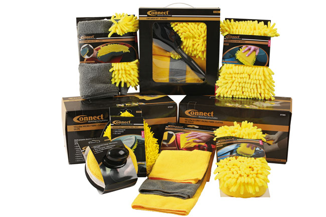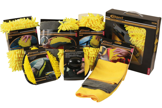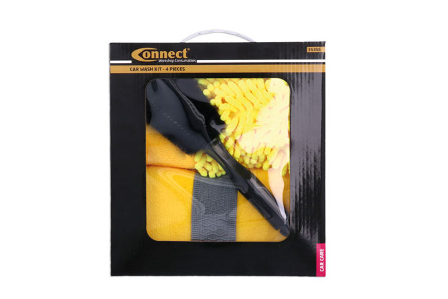 A 4 piece professional car cleaning kit comprising of a microfibre noodle wash mitt, a microfibre cloth, an alloy wheel brush, and a microfibre sponge. Suitable for use in the workshop, bodyshop, or at home. The wash mitt features an abrasive mesh fabric on one side to help remove stubborn dirt or marks on one side, and absorbent microfibre noodles on the other to trap dirt and grime and lift it away from the vehicle with ease. The microfibre cloth absorbs water and leaves a streak free finish. The alloy wheel brush features flexible head and tough bristles enabling it to actively lift dirt, road grime and brake dust from the wheel surfaces without causing damage to the finish. The microfibre sponge holds water and features a strap for better grip and is finished in a soft scratch free material.