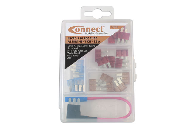 A mixed set of micro 3 blade fuses designed for modern vehicles. The fuse has 3 terminals and 2 fuse elements and the small design saves space and weight. A fuse puller and 'add-a-circuit' fuse holder are also supplied.